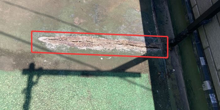 現地調査をおこなったところ、ベランダの床面にひび割れや浮きがあり、歩くと沈むような感触がありました。